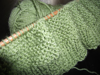 I am really pleased that I started it again. I've been really poorly the last couple of weeks, so it's nice to have a project which requires 18cm of GS before you have to even bat an eyelid at a pattern. Each row is 90 stitches, so I have only managed to do 8 rows of rib and 14 rows of GS so far (that's 1,980 stitches altogether).