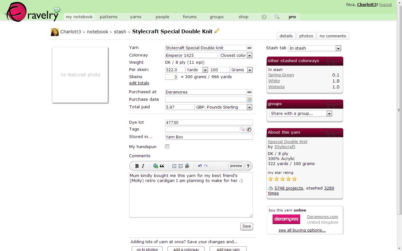 If you don't have your yarn stashed, don't worry! Just add it on the project page like so: